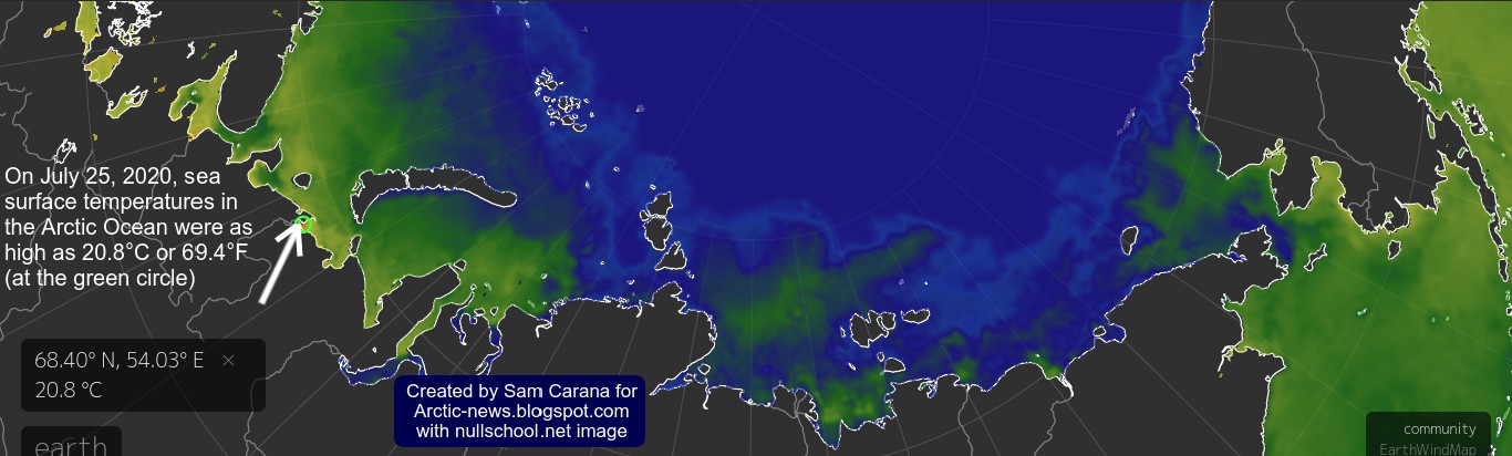On July 25, 2020, sea surface temperatures in the Arctic Ocean were as high as 20.8°C or 69.4°F (at the green circle on above image).